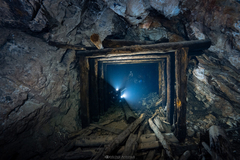 It was time to divide into teams – the surface team and the underground team. I purposely use the term ‘underground’ instead of ‘underwater’ to emphasize that Maria Concordia is a mine that is only partially flooded. In order to reach the water, we needed to descend approximately 40 meters into the shaft using an electric winch, under the supervision of the facility owner and his team. The descent itself was an incredible experience. As we descended into the dark shaft, passing by the entrances to dry levels, the sense of adventure was palpable. At the bottom, we were greeted by an illuminated chamber specifically prepared for divers, where we equipped ourselves on a steel platform at water level. While the descent was an adventure in itself, it did present logistical challenges. The air humidity in the ‘dry’ chamber was so high that we decided not to replace batteries in cameras and flashlights there. Although the equipment would probably be fine, there was a risk of moisture entering the waterproof GoPro cases and causing condensation and fogging from the inside. Therefore, after each dive, we had to bring the entire set of cameras and lights back up to the surface, where the surface team would replace the batteries and transfer the data to the hard drive.